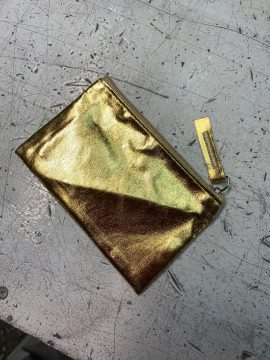 PU素材、こちらにスクリーン印刷  特に問題はない、使用するインキはSG740  今回は不思議と金色のポーチに金色で刷ってほしいという事になった
