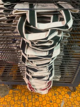 写真のようなバッグ、特に問題は無いが真ん中のポケットにプリント。ここの縫製が全てバラバラなので、ポケットを基準に位置合わせをしなければならない。
