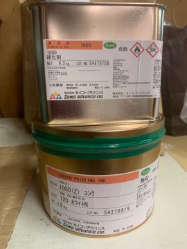 硬化剤を入れて2液性のインクは混合比率がある場合がある。 1000や1690の場合、硬化剤を入れないで刷るとまったく密着しないかいつまでも乾燥しない場合がある。ここらへんは要注意だ