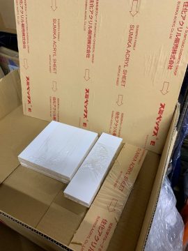 白いアクリル、どこかのビルの案内板らしいが、カッティングかインクジェットをお勧めしたが、こちらだけはシルク印刷がいいとの事